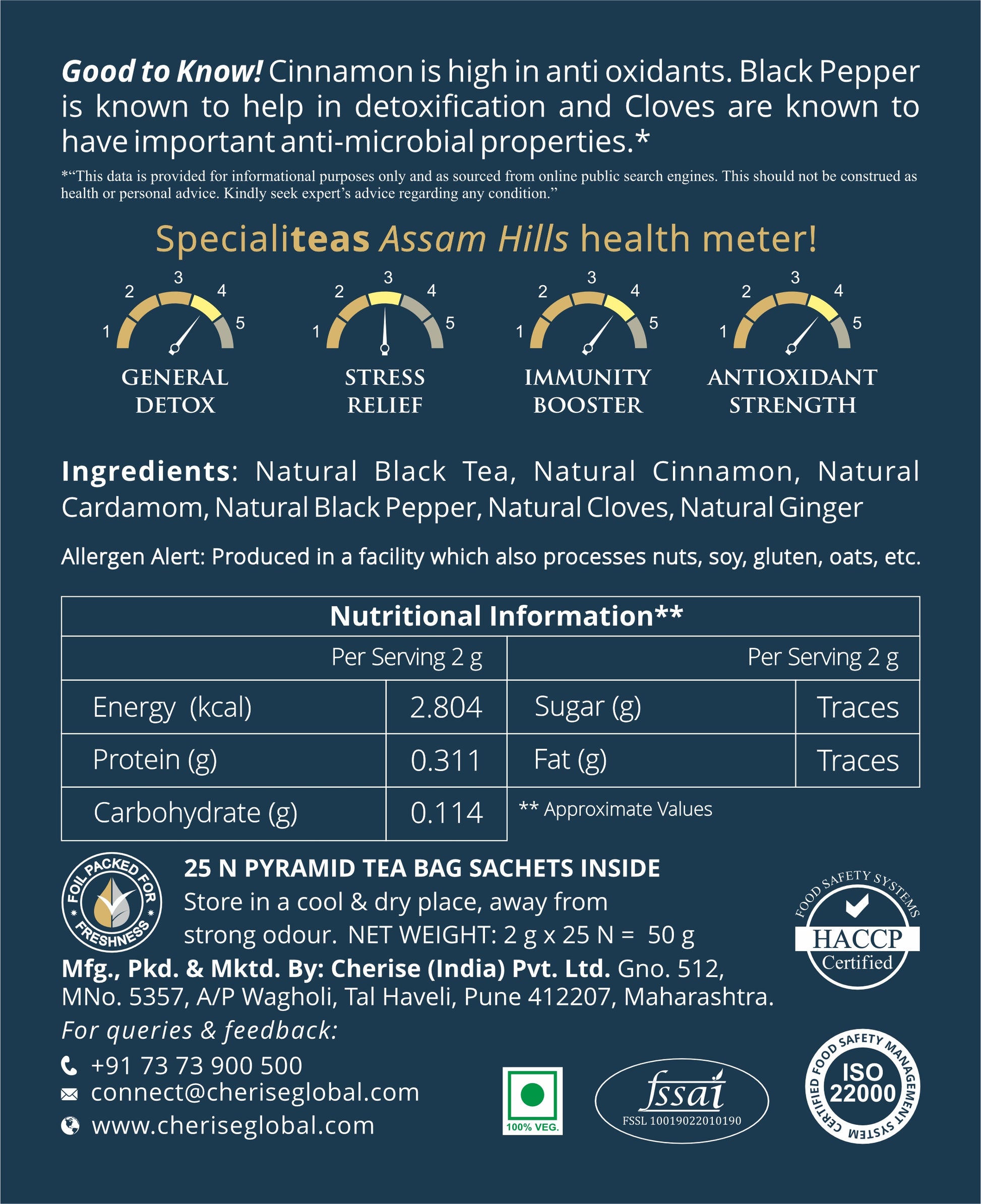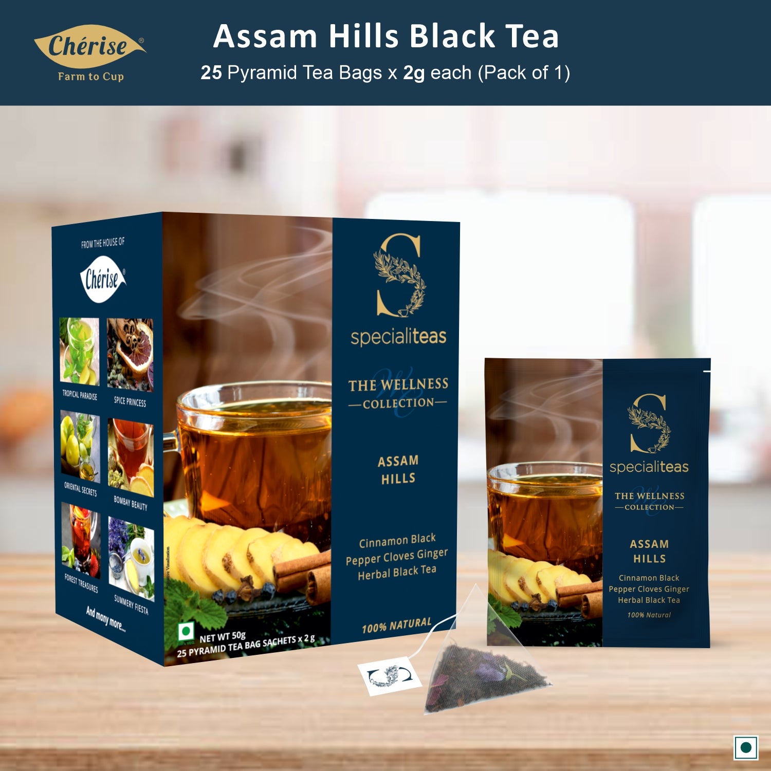 Cherise Specialiteas Assam Hills Cinnamon Black Pepper Cloves Ginger Herbal Black Tea (2 g x 25 Pyramid Tea Bags)