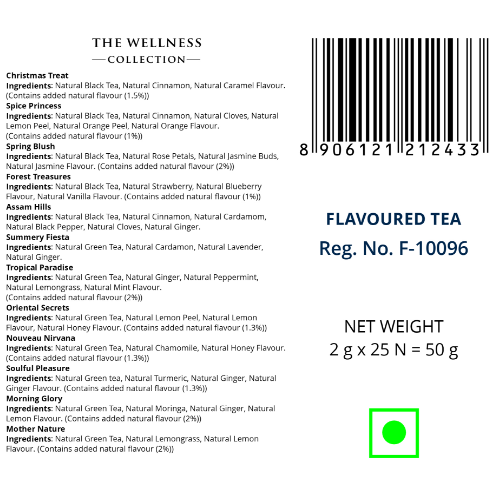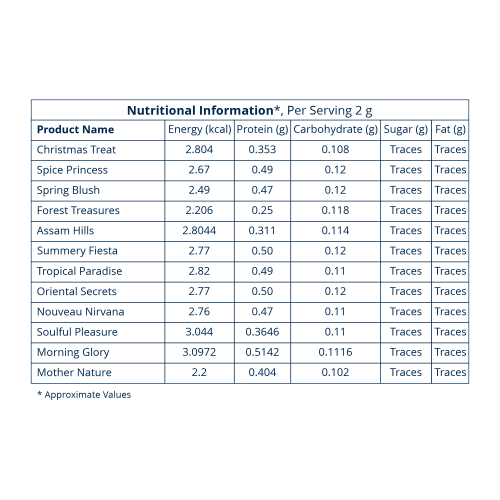 Natural Black Tea, Natural Cinnamon, Natural Caramel Flavour, Natural Cloves, Natural Lemon Peel, Natural Orange Peel, Natural Orange Flavour, Natural Rose Petals, Natural Jasmine Buds, Natural Jasmine Flavour, Natural Strawberry, Natural Blueberry Flavour, Natural Vanilla Flavour, Natural Cardamom, Natural Black Pepper, Natural Ginger, Natural Lavender, Natural Green Tea, Natural Peppermint, Natural Lemongrass, Natural Mint Flavour, Natural Honey Flavour, Natural Chamomile, Natural Turmeric, Natural Moringa