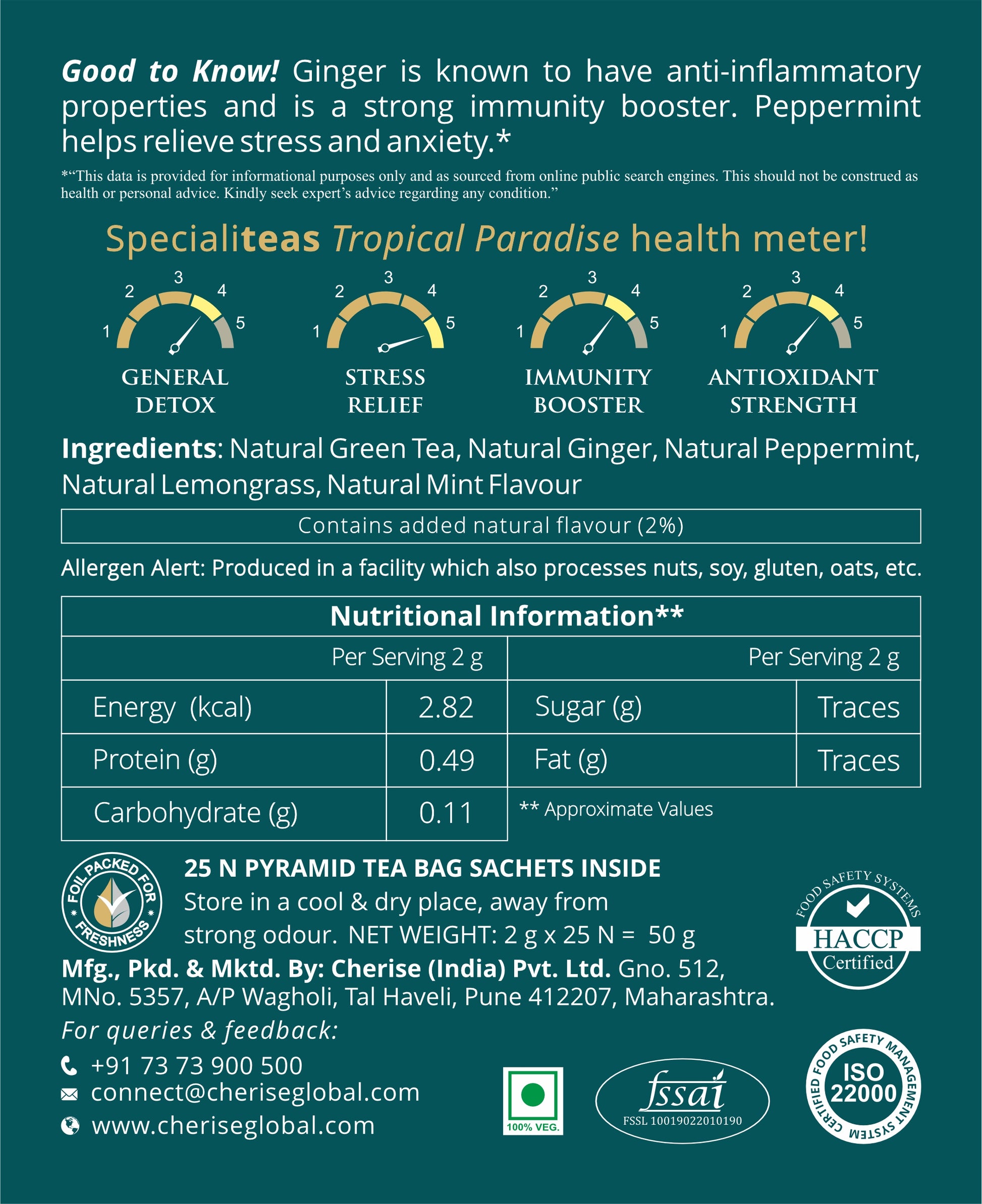 Cherise Specialiteas Tropical Paradise Ginger Mint Herbal Green Tea (2 g x 25 Pyramid Tea Bags)