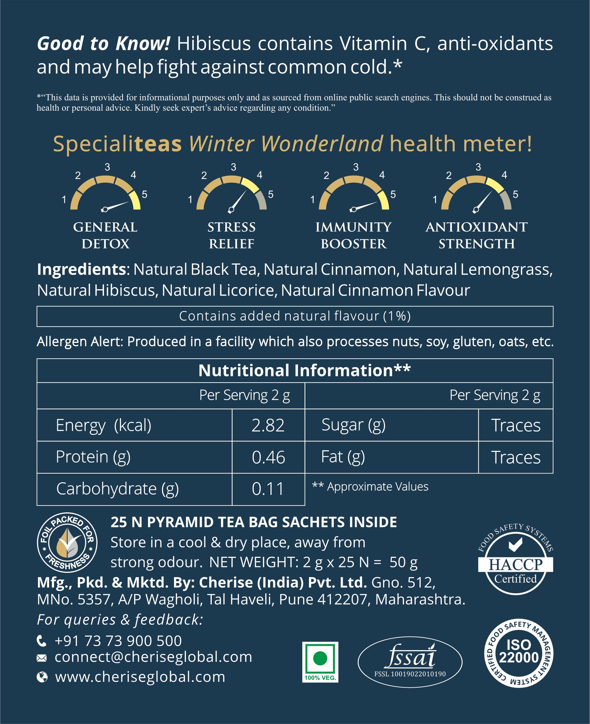 Cherise Specialiteas Winter Wonderland Hibiscus Cinnamon Herbal Black Tea (2 g x 25 Pyramid Tea Bags)